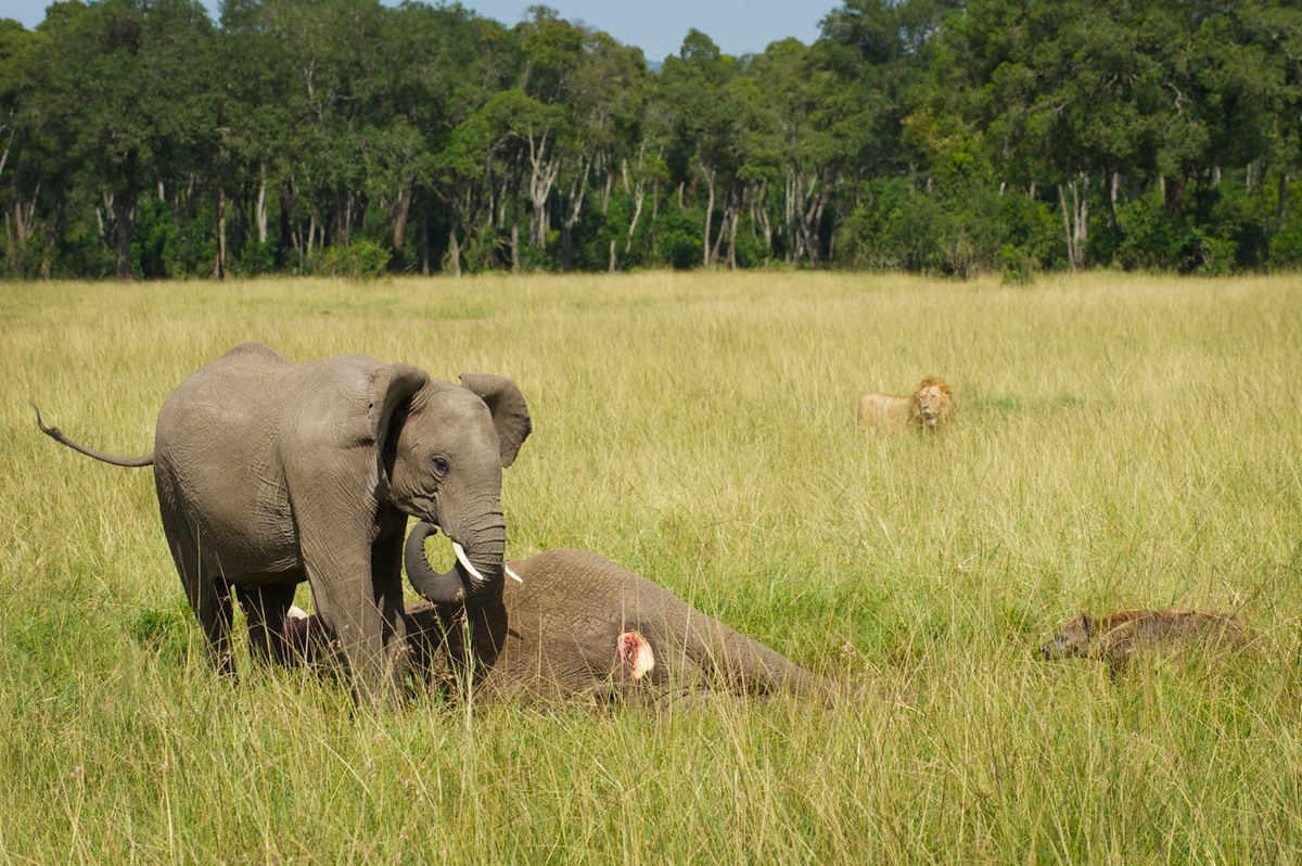 掠食者们来临,狮子、鬣狗在等待时机。小象机警地站起来守卫妈妈的遗体。