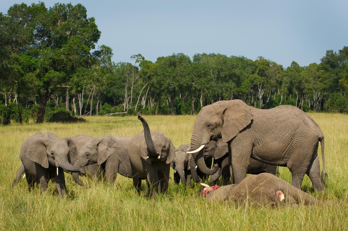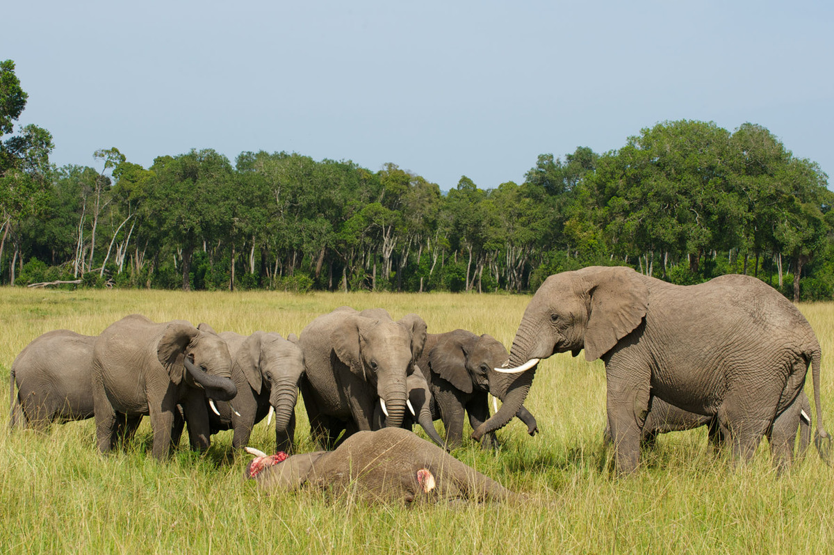 象妈妈去世之初,象群围拢象妈妈的遗体,有的成员一次又一次次用象鼻触碰已经倒下的家庭成员,而其他成员选择了默哀。