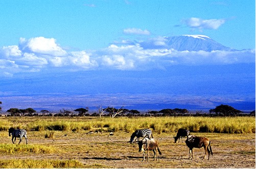 乞力马扎罗山,斯瓦希里语Kilimanjaro,意为“灿烂发光的山”。它位于坦桑尼亚东北的乞力马扎罗区,临近肯尼亚边界,是坦桑尼亚的最高峰。乞力马扎罗山的部分山区被指定为乞力马扎罗国家公园,整个山脉东西绵延50公里左右,由七座主要的山峰,其中三座是死火山,马文济峰(Mawensi 5,149米)、西拉峰(Shira 3,962米)和基博峰(Kibo 5,893米)。基博峰上面的乌呼鲁峰(Uhuru)是非洲的最高峰,还不时释放出火山气体。